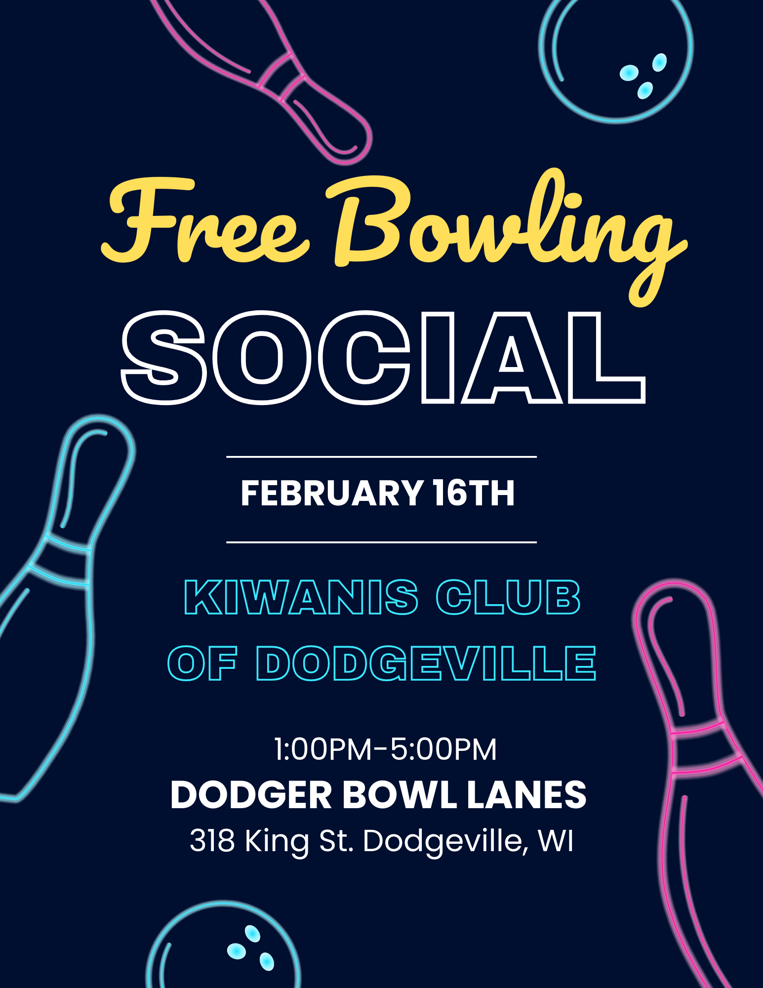 Dodgeville Kiwanis Club is hosting a Free Bowling Social event at the Dodger Bowl Lanes in Dodgeville