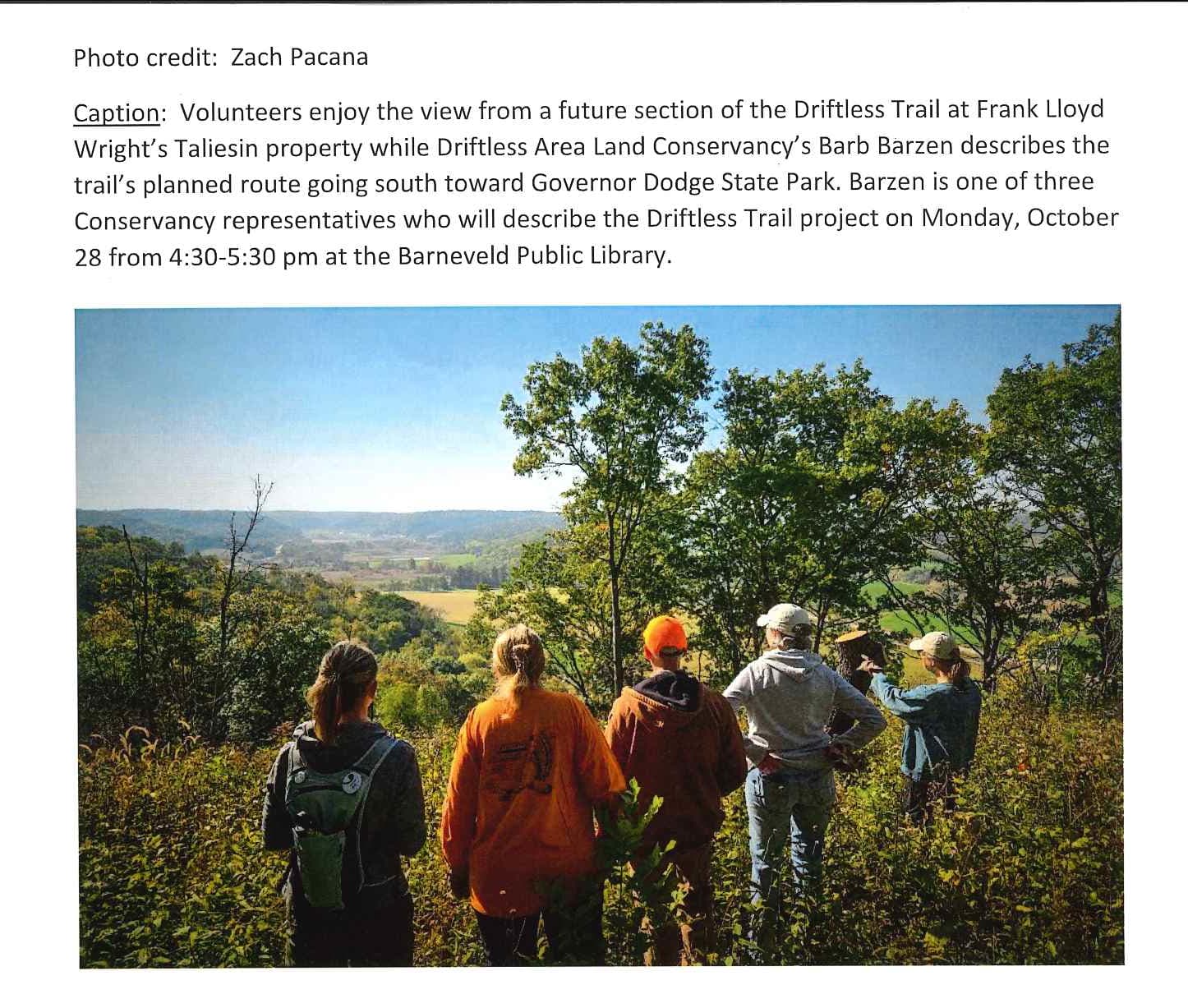 On Monday, October 28 from 4:30-5:30 pm, Driftless Area Land Conservancy will present “The Driftless Trail – Why, What and Where” at the Barneveld Public Library’s community room to update the public on the trail’s progress. Speakers will include executive director Jen Filipiak, Driftless Trail project coordinator Barb Barzen, and trail host (landowner) Nan Fey.