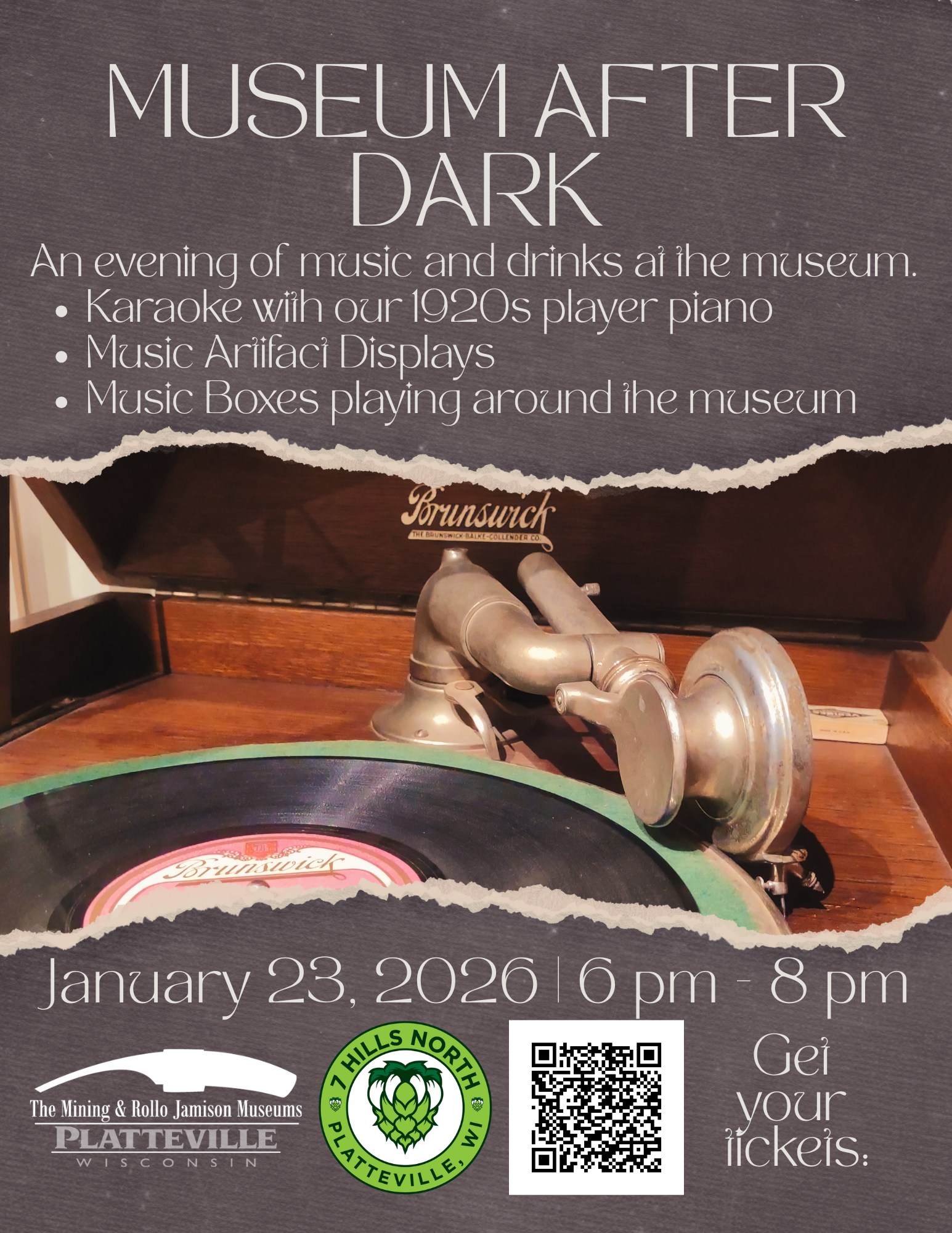 Organization: Mining & Rollo Jamison Museums Date: Friday, January 23, 2026 Time: 6:00 p.m. to 8:00 p.m. Location: 405 East Main Street, Platteville, WI 53818 Admission: $20 General; $18 Seniors Website: https://mining.jamison.museum/programs/ The Mining & Rollo Jamison Museums invite guests to enjoy a lively evening of music, drinks, and fun inside the museum. Visitors can try karaoke accompanied by an authentic 1920s player piano, explore fascinating music-related artifacts, and stroll through galleries filled with lively music boxes playing throughout the space. It’s a unique chance to experience history in a fun, interactive atmosphere. Hosted at The Mining & Rollo Jamison Museums in Platteville, Wisconsin, this special event takes place on January 23, 2026, from 6–8 p.m. In partnership with 7 Hills North, the evening blends local flavor with vintage sound for an unforgettable night. Grab your ticket and enjoy the museum like you’ve never seen—or heard—it before. Snacks and beer from 7 Hills Brewing Company will be available for anyone attending over the age of 21. Contact: Cody Grabhorn, museumdirector@platteville.org Or Summer Hamille, museumadministration@platteville.org Phone: 608-348-3301Images