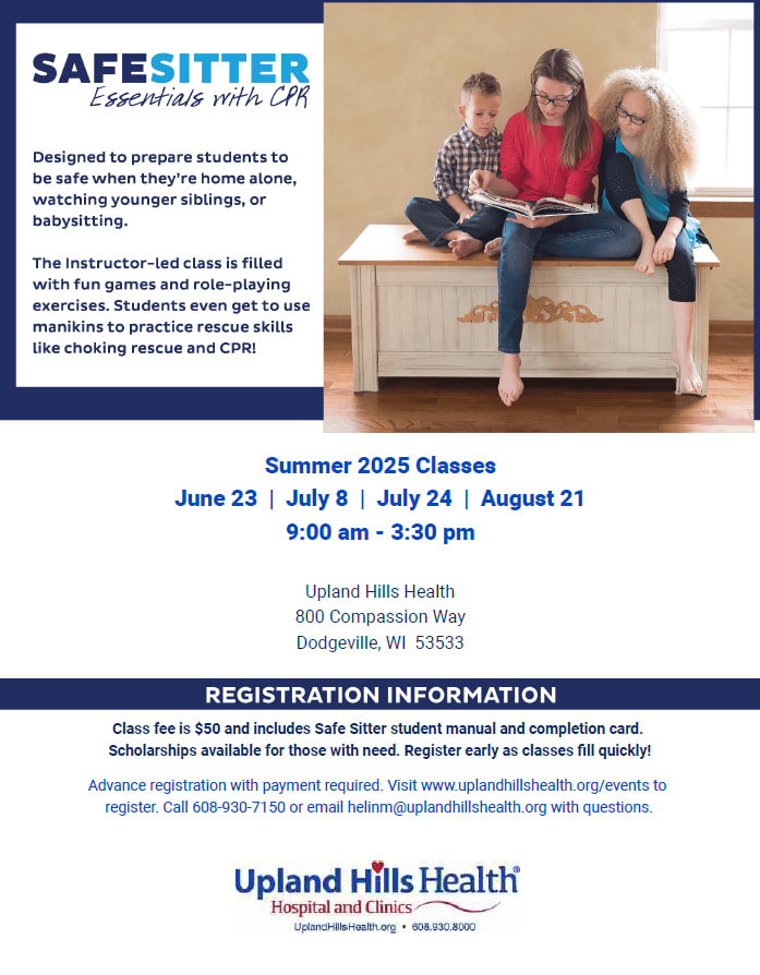 Class fee is $50 and includes Safe Sitter student manual and completion card. Scholarships available for those with need. Register early as classes fill quickly! Advance registration with payment required. Visit www.uplandhillshealth.org/events to register. Call 608-930-7150 or email helinm@uplandhillshealth.org with questions.Images